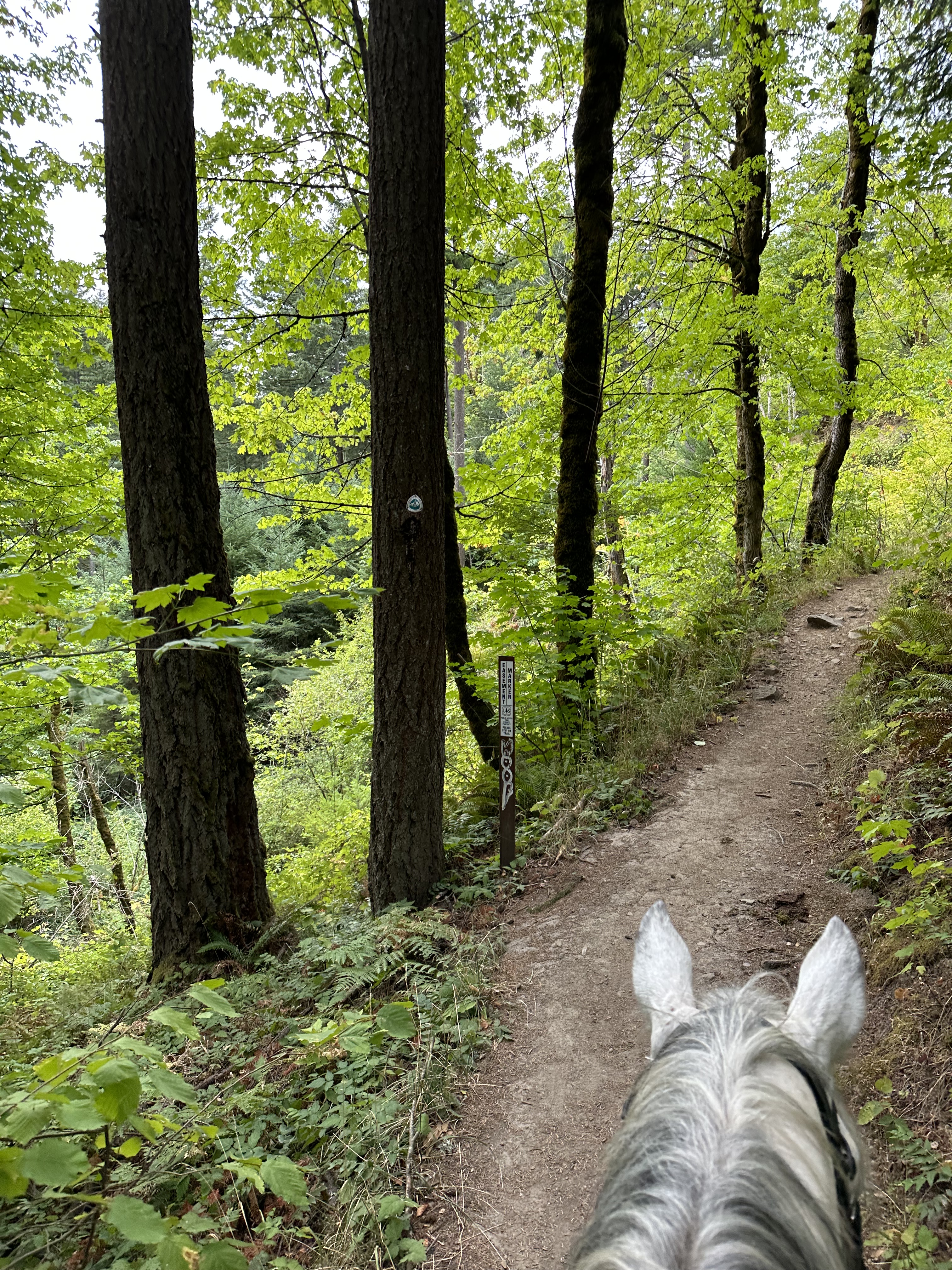 Trail Challenges: Trail is well maintained but as of 2024 there were two leaning trees that we had to dismount to go under. No water crossings. Short (approx. 20 feet) rocky section with loose footing in last half of trail. The first part of the trail crosses over a train tunnel – use caution if you hear a train coming as the noise could spook a horse.