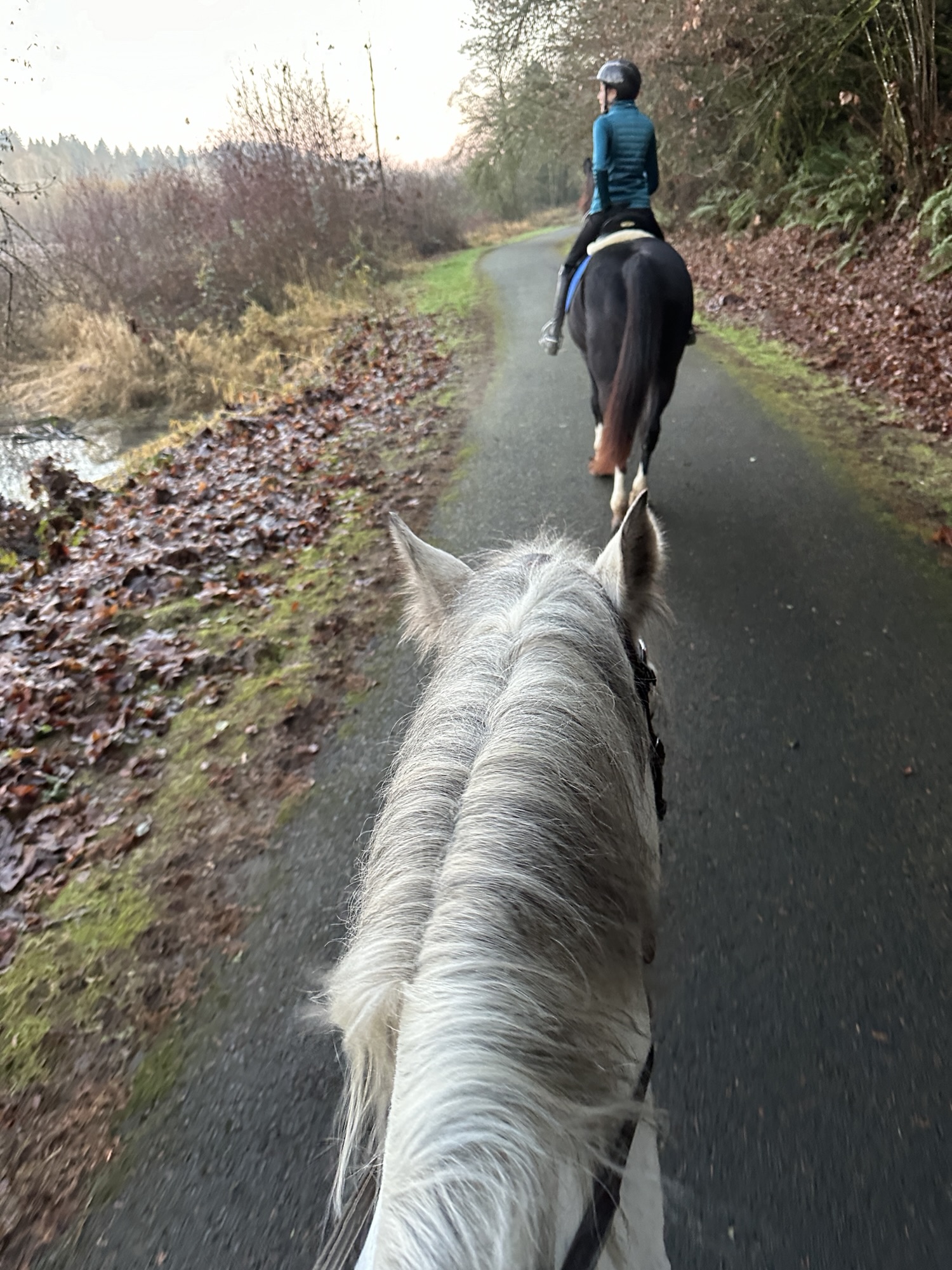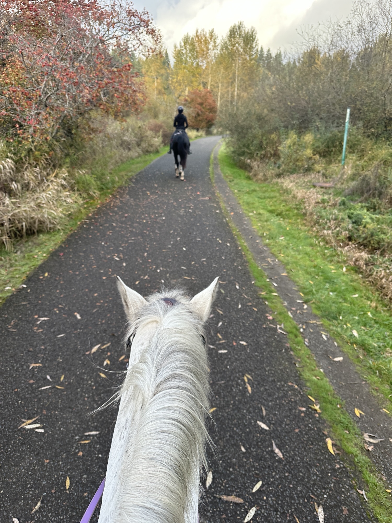 Trail Challenges: Paved trails. Bridge. Trees can be overgrown for horses on the dirt trail but passable. Multi user trail system – expect runners, bikes, etc. This trail hardly ever sees horses so people want to chat with you and may not know horse etiquette. You will need a steady horse that doesn’t mind non-horse-savvy people.