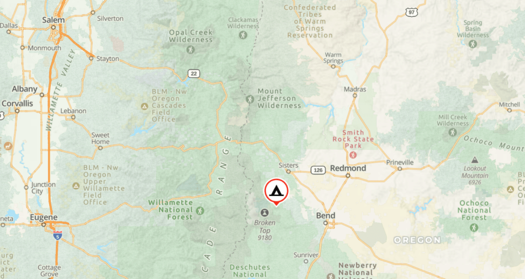 Directions: From Sisters, OR: Travel 15.2 miles south on Forest Road 16 (Elm Street in Sisters).