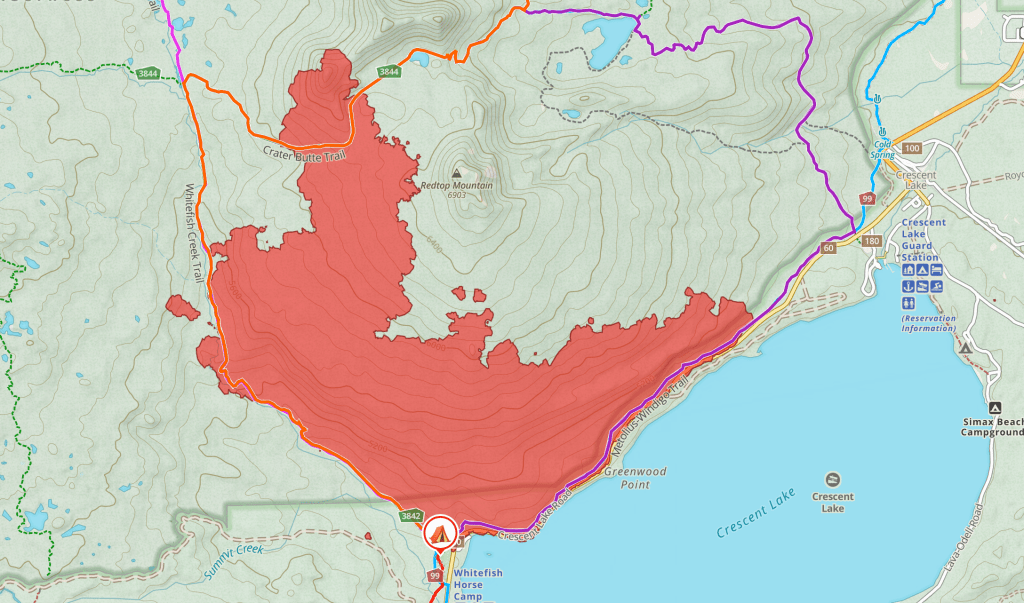 - Summer 2024 – Red Fire affected the area north of camp. Perimeter shown below. Use caution in burn areas.