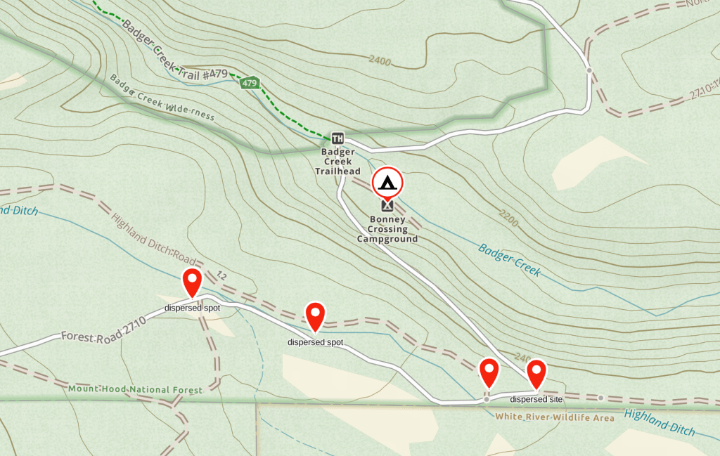 Bonney Crossing Campground is a low use camp located on the eastern flank of Mt Hood National Forest in NW Oregon. This camp is shared with non-equestrian sites and provides access to the Badger Creek Wilderness. The road into camp is steep gravel with a drop off. For those without 4×4 you may consider dispersed camping at the top of the hill.