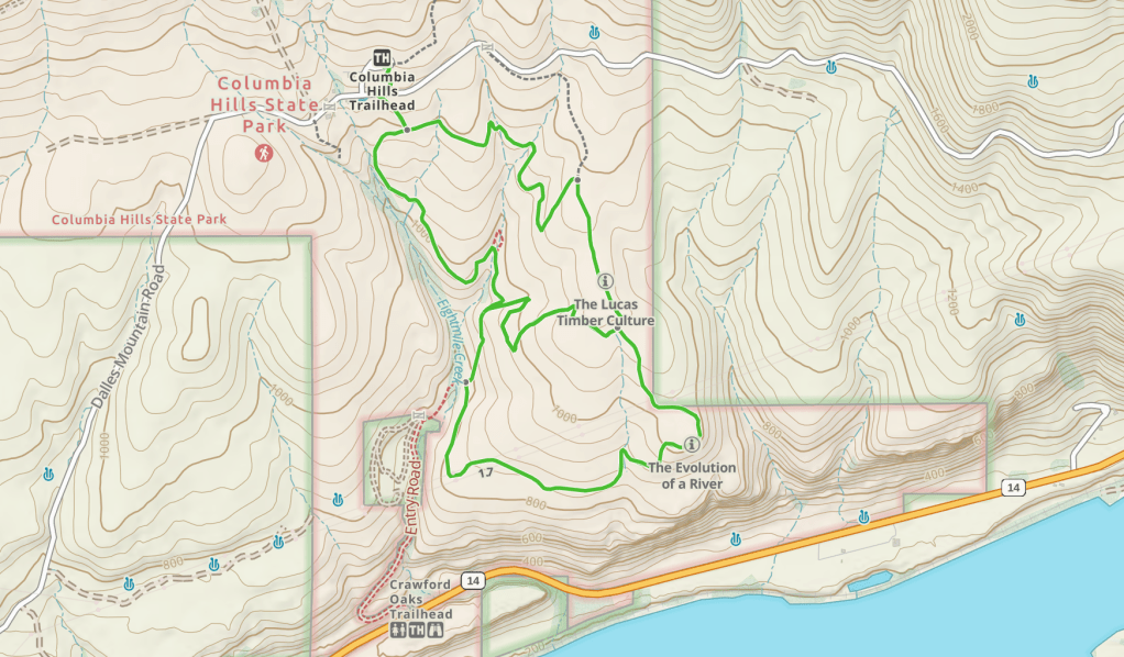 Note: Dalles Mountain Ranch Trailhead is marked as Columbia Hills Trailhead on Gaia but they are the same thing.
