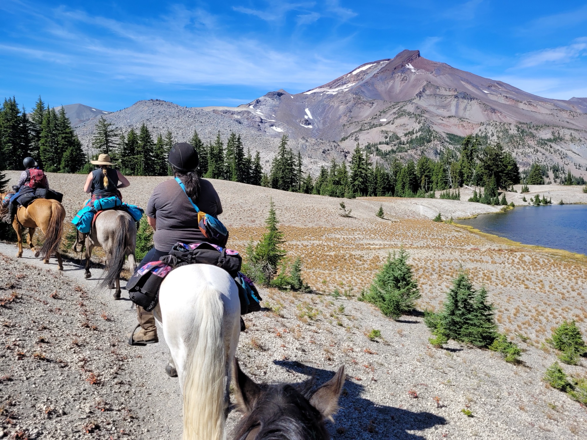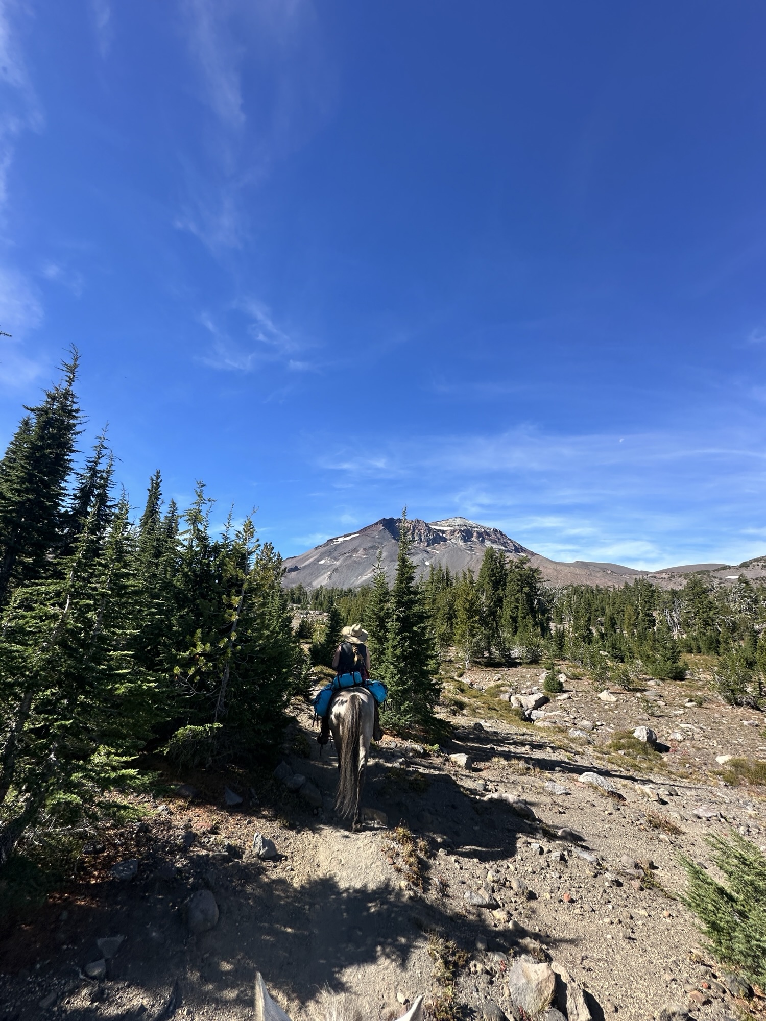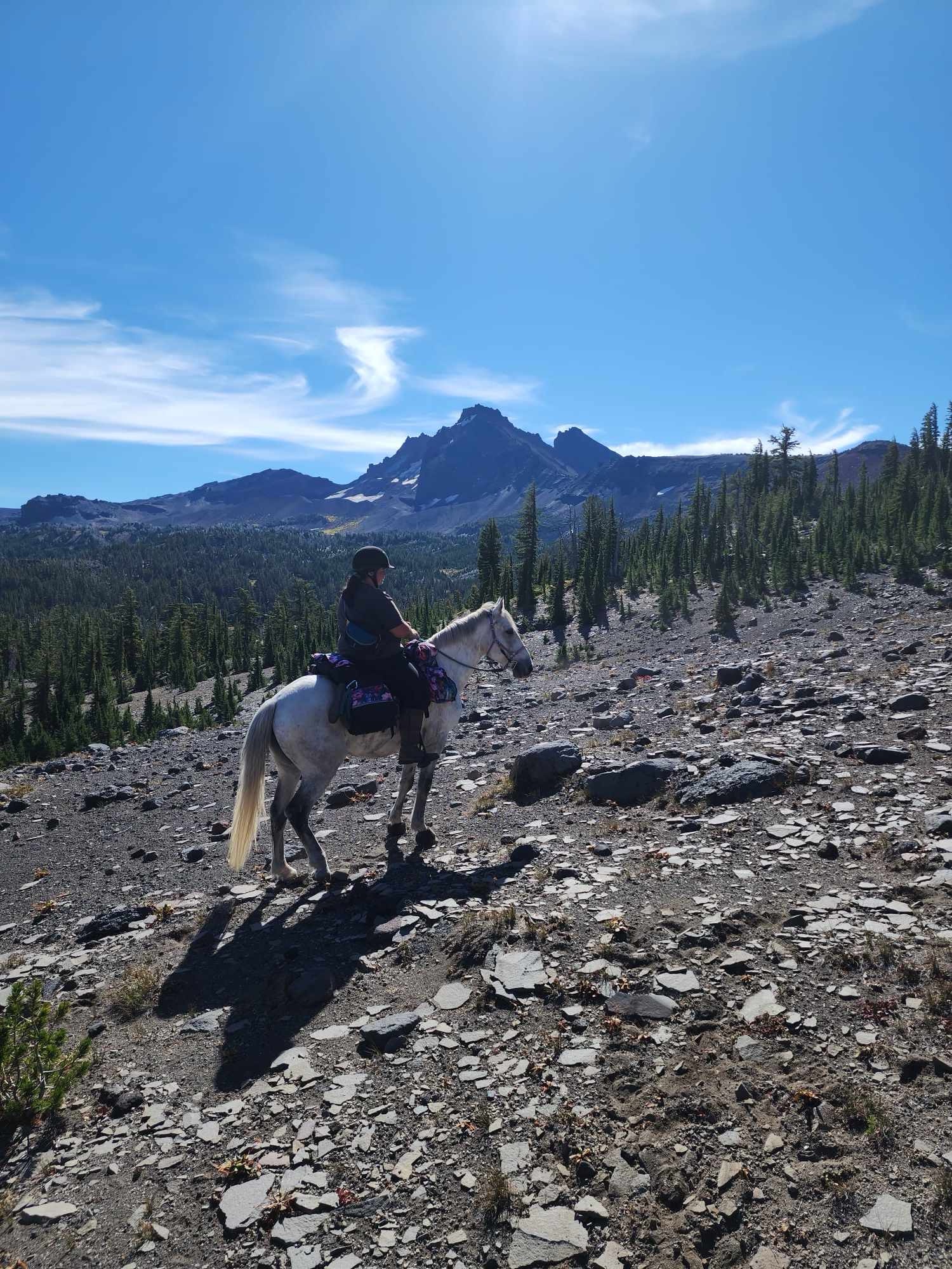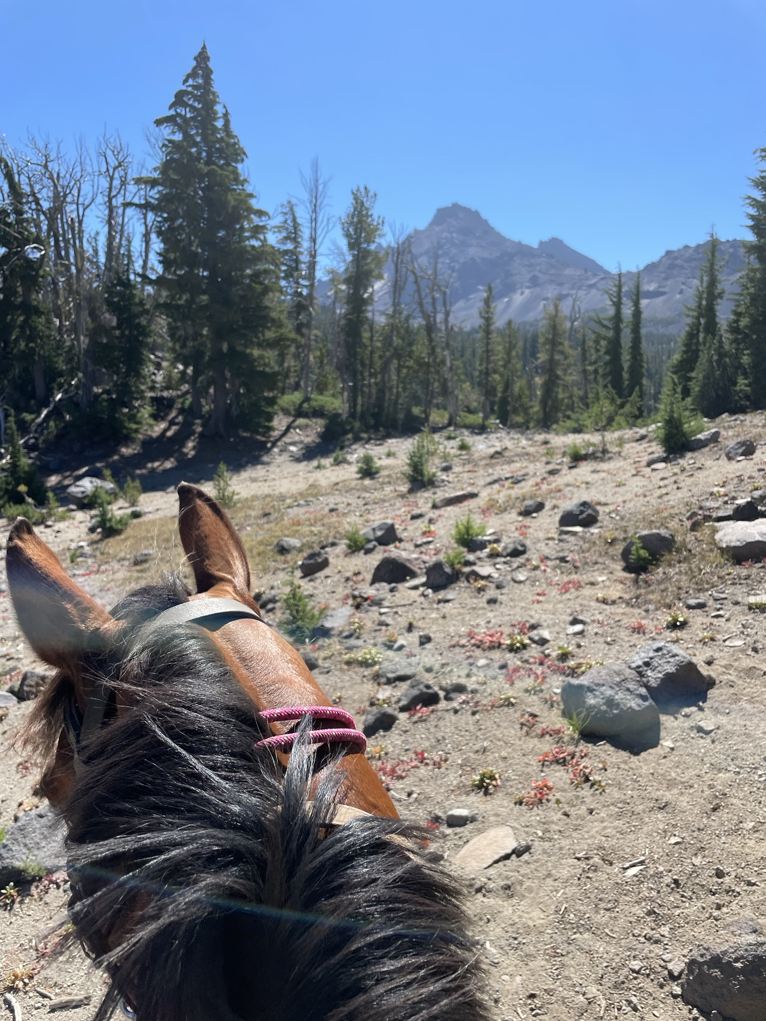 This ride starts out of Three Creek Meadow Horse Camp. For those who have a willing and able horse for a long ride with big elevation gain, you only need a self-issued wilderness permit from this trailhead – no need for the pre-reserved Central Cascades Wilderness Permit. This ride goes through a burn for a bit, but it’s grown back enough to have pops of wildflowers to enjoy.