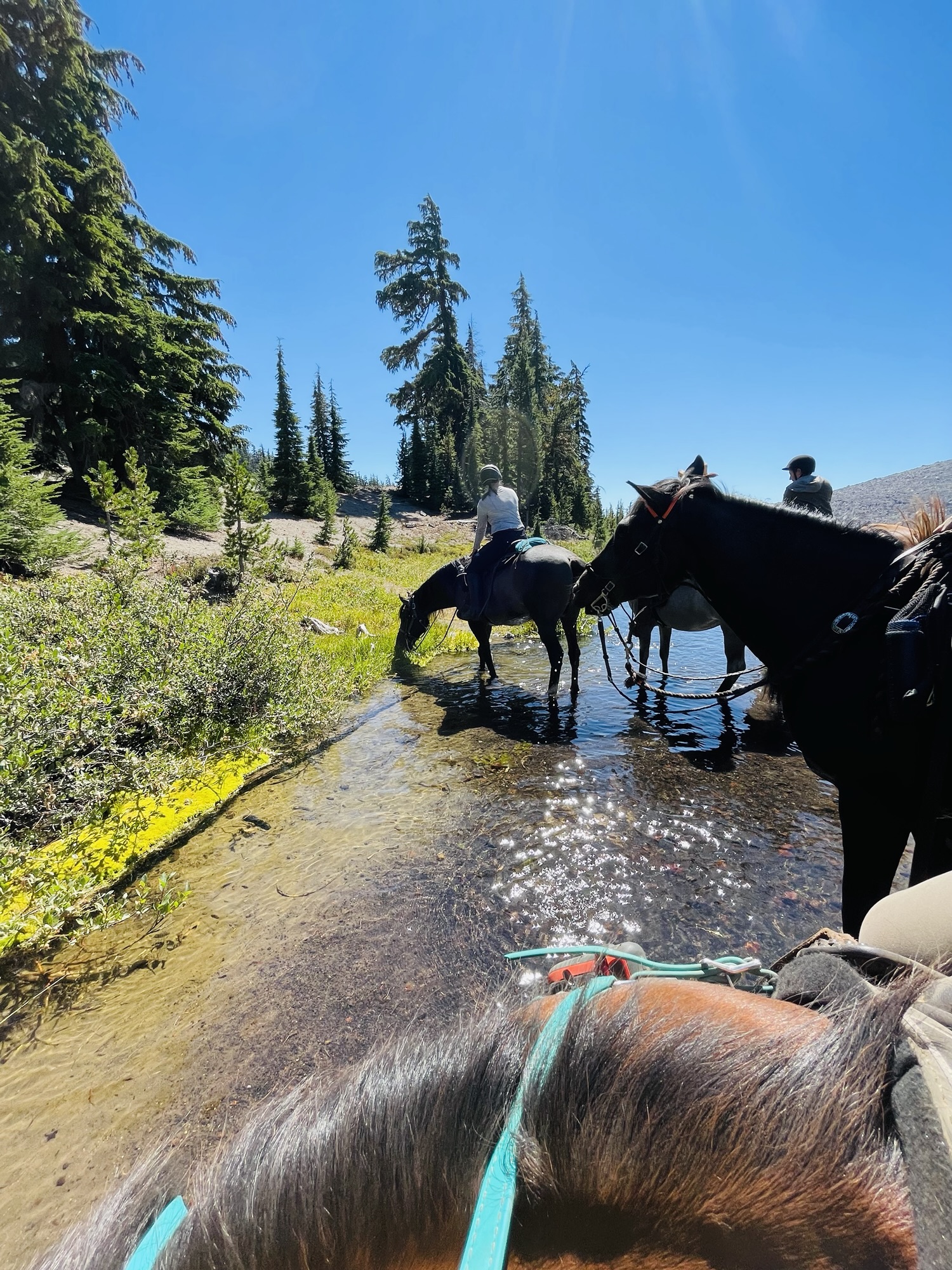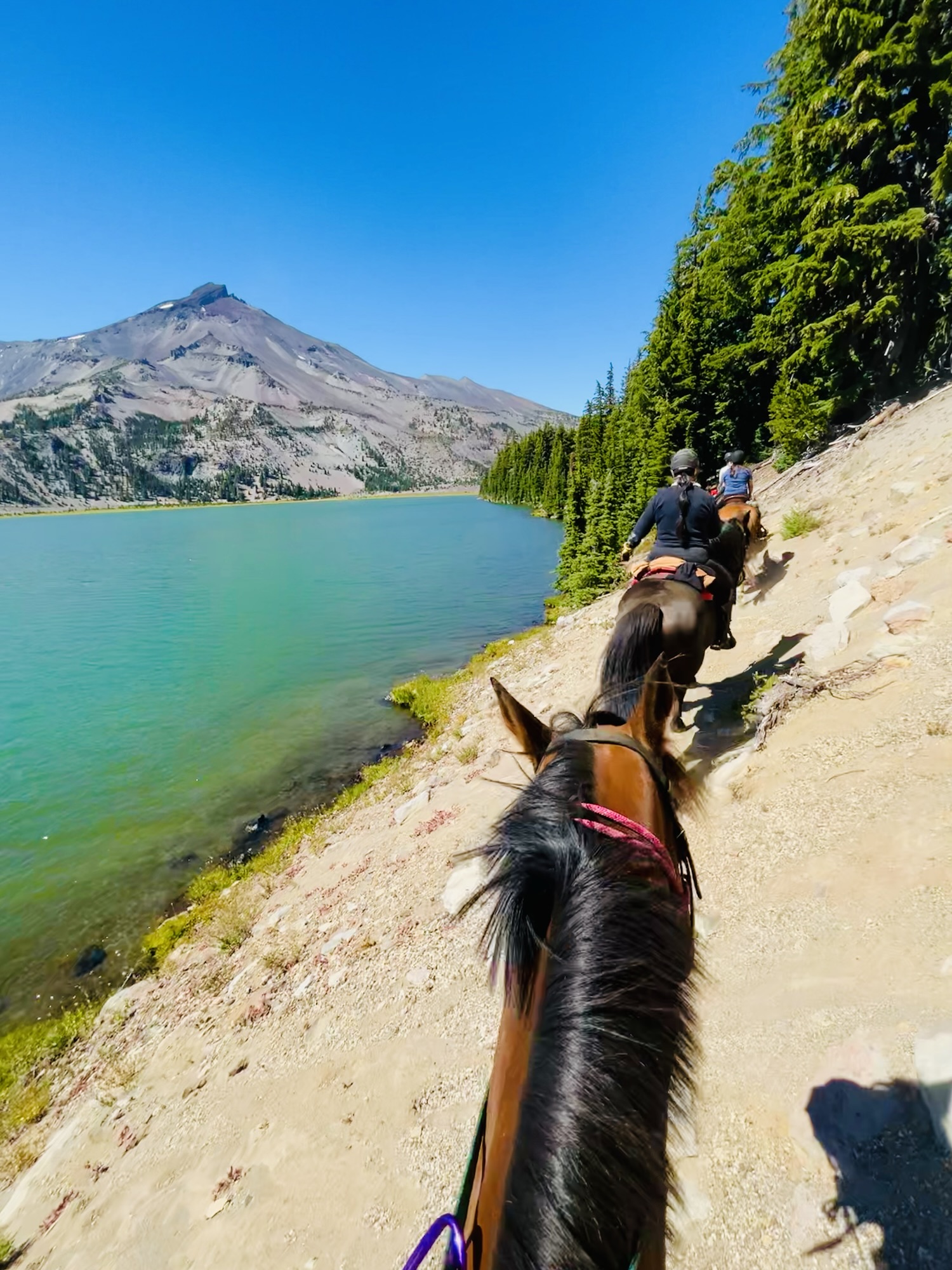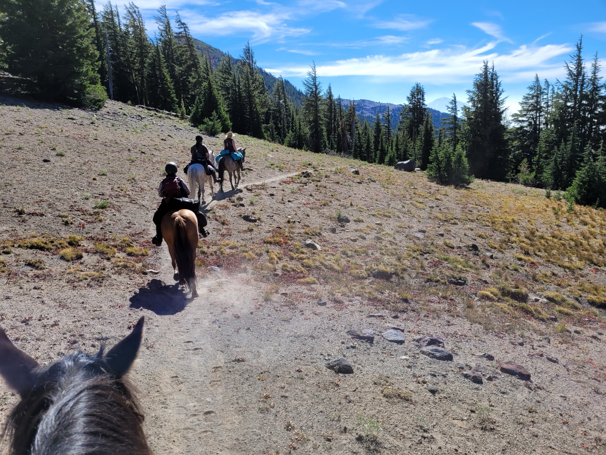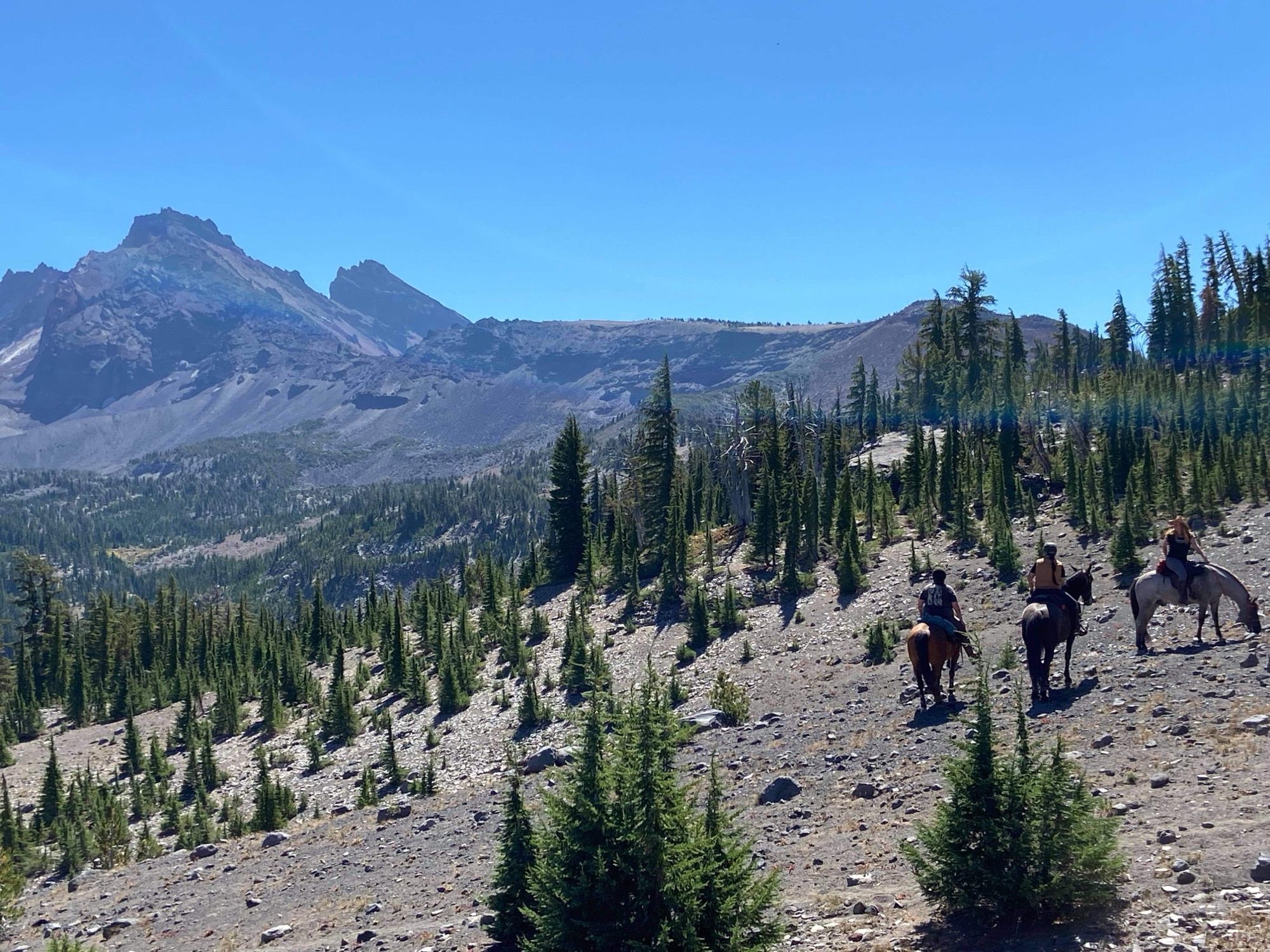 This ride starts out of Three Creek Meadow Horse Camp. For those who have a willing and able horse for a long ride with big elevation gain, you only need a self-issued wilderness permit from this trailhead – no need for the pre-reserved Central Cascades Wilderness Permit. This ride goes through a burn for a bit, but it’s grown back enough to have pops of wildflowers to enjoy.