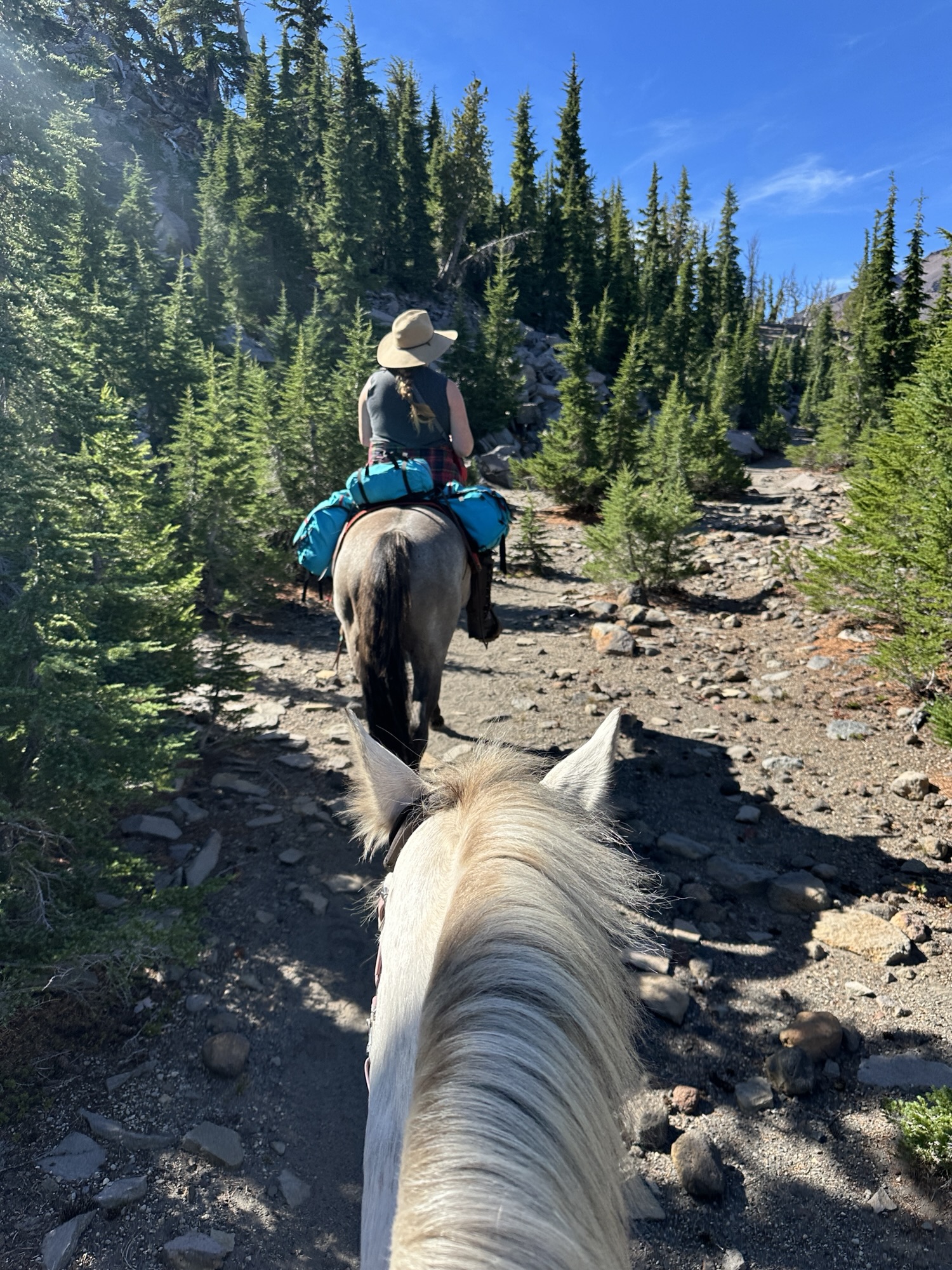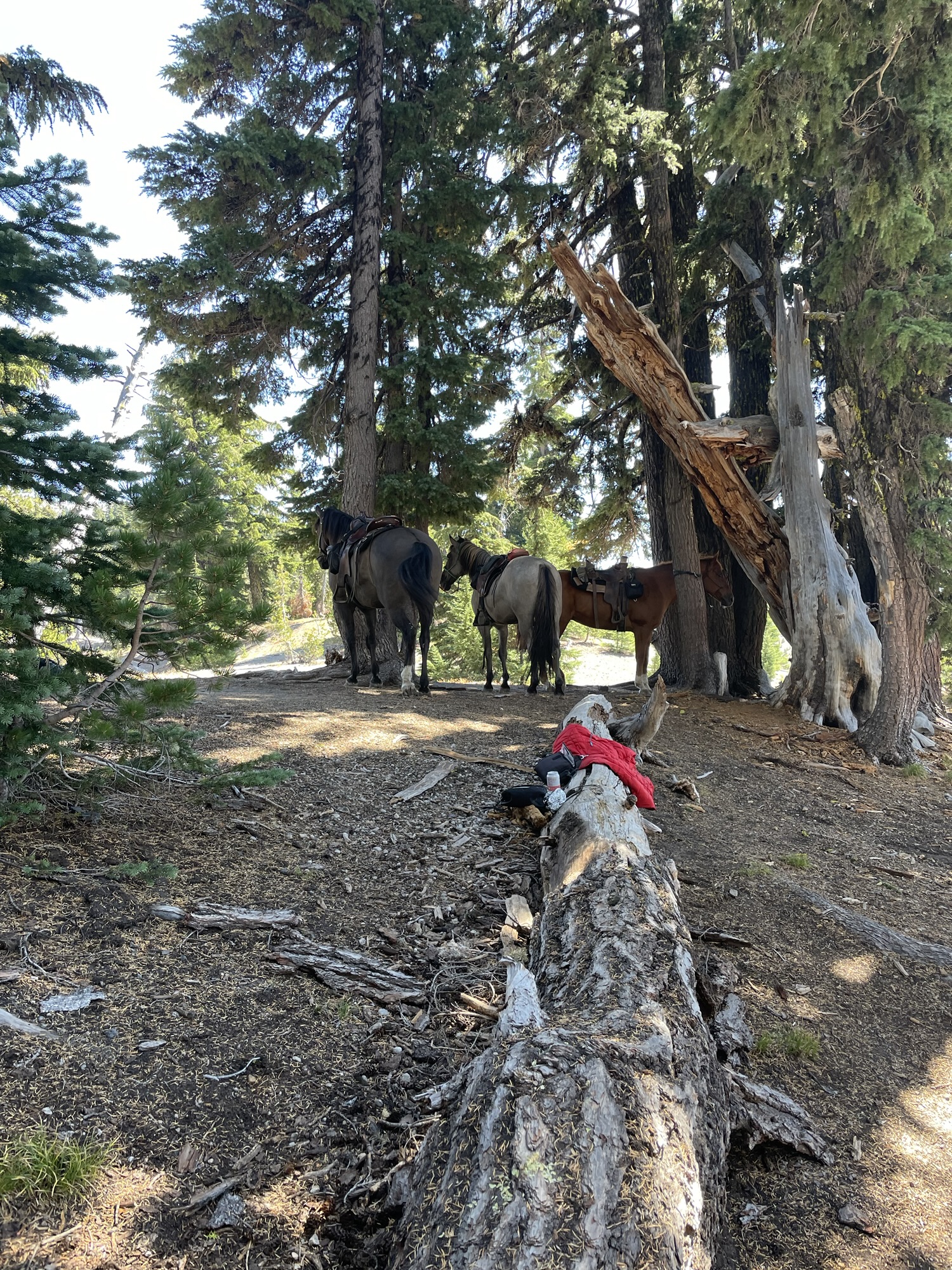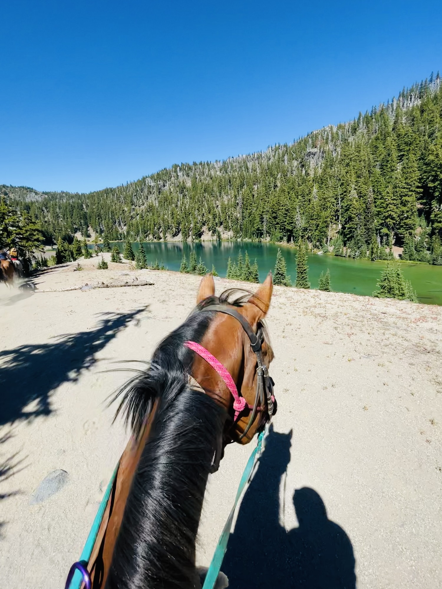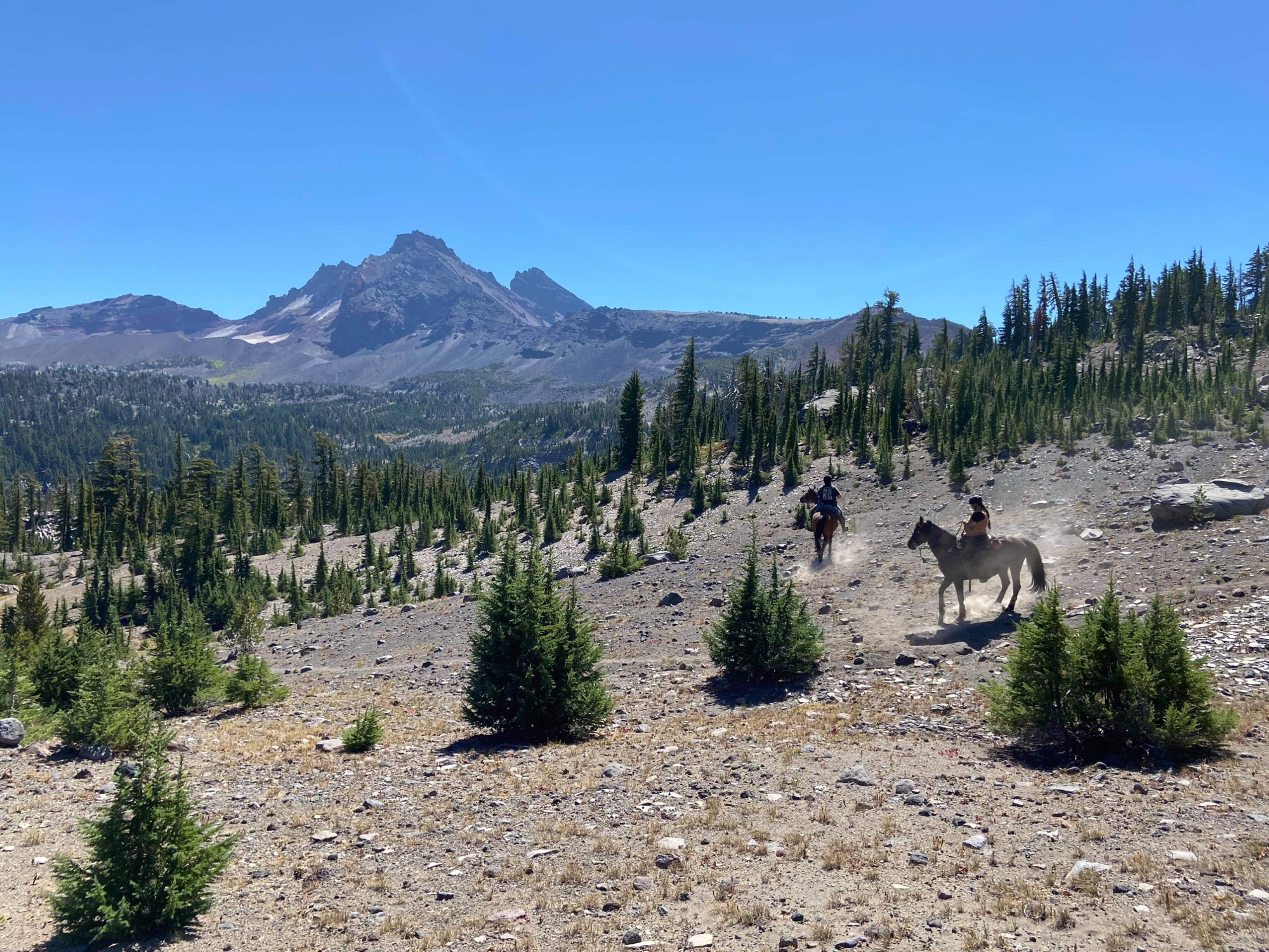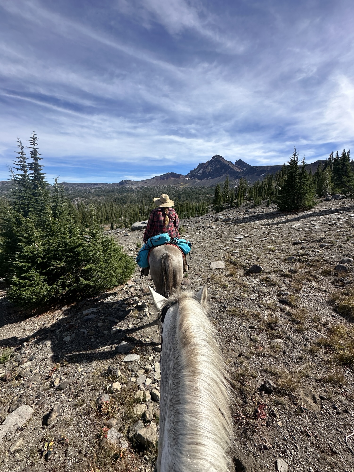 This ride starts out of Three Creek Meadow Horse Camp. For those who have a willing and able horse for a long ride with big elevation gain, you only need a self-issued wilderness permit from this trailhead – no need for the pre-reserved Central Cascades Wilderness Permit. This ride goes through a burn for a bit, but it’s grown back enough to have pops of wildflowers to enjoy.