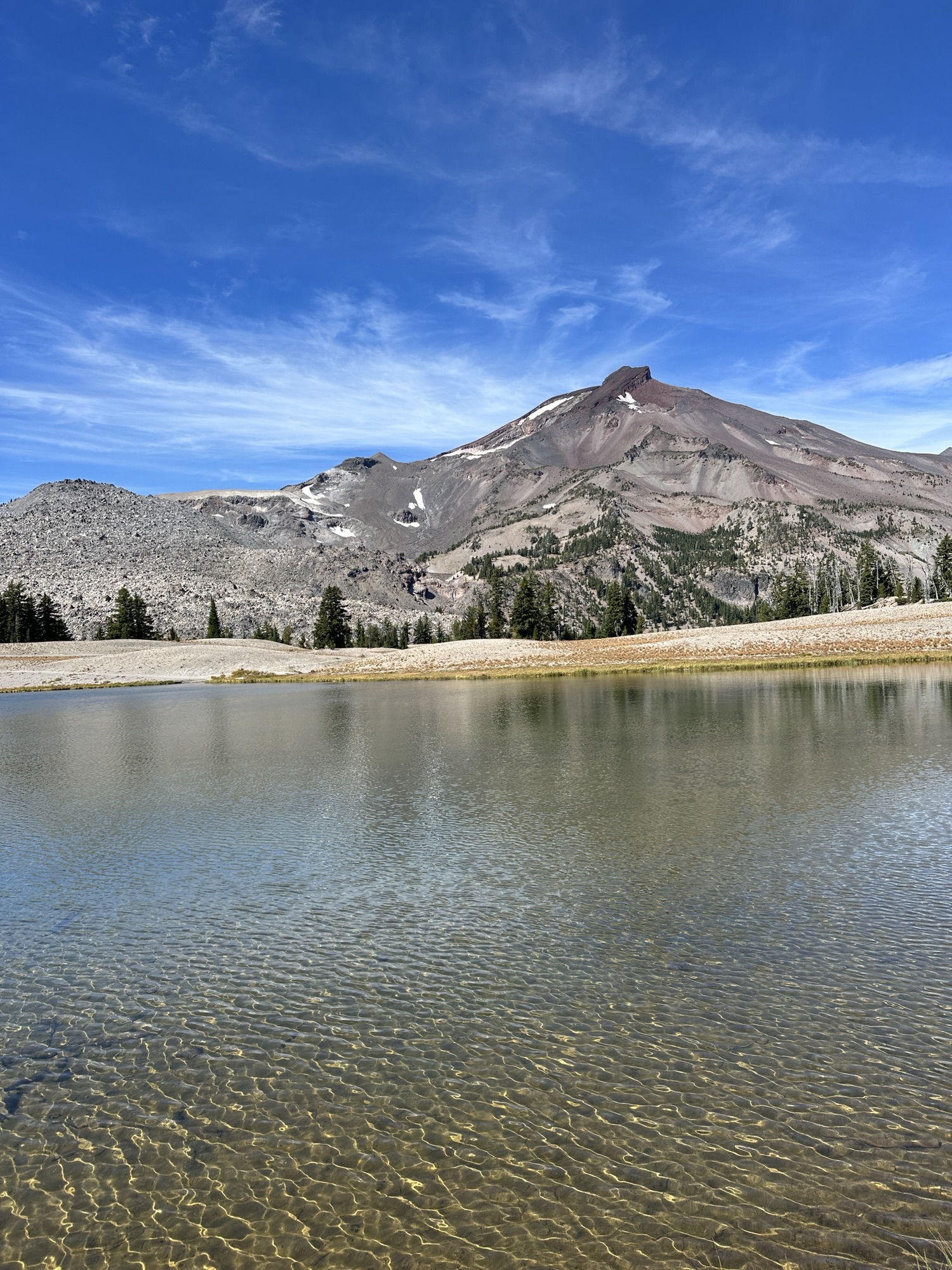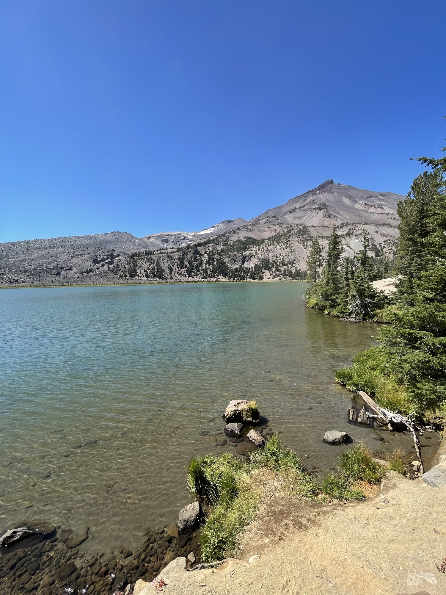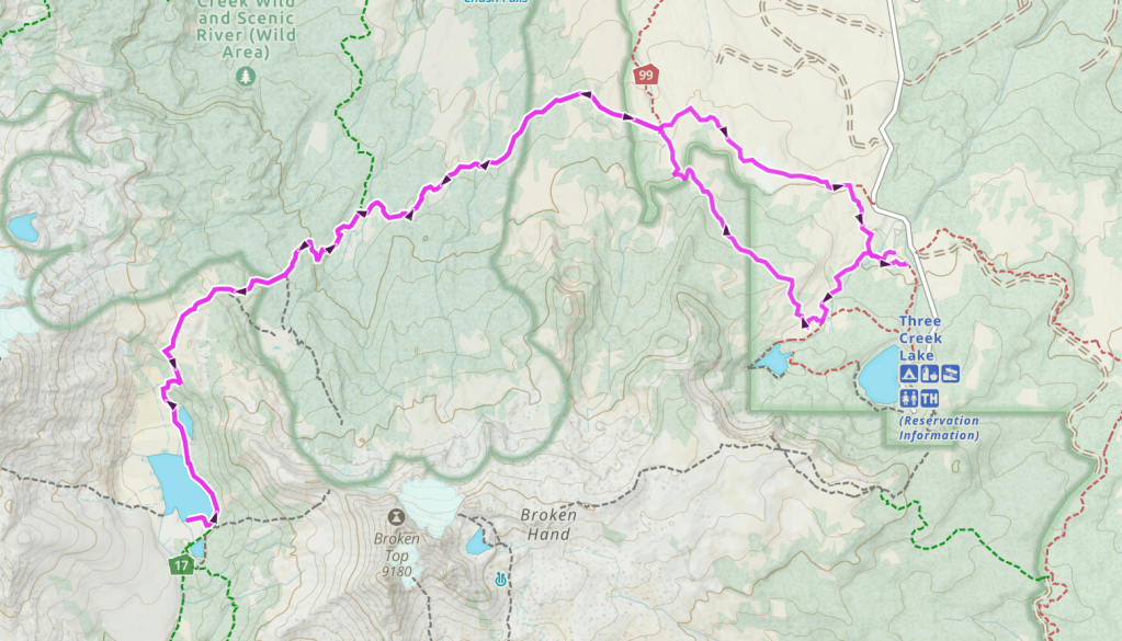 Trail Info: Head out of the west side of horse camp on Three Creek Meadow Trail. Follow this trail for 0.2 miles. At the junction, veer right onto Metolius-Windigo Trail for 0.6 miles. At the next junction, turn left onto Park Meadow Trail and follow it for 1.8 miles to a 4-way junction. This spot can be confusing so pay attention to your map. Continue straight for another 2.9 miles. At the next junction keep left on Green Lakes Trail. After 0.4 miles you will come to a steep narrow section of trail, after another 1.1 miles you will come to a viewpoint of Broken Top. Continue for another 2.2 miles to the loose edge along the lake. It has continuously eroded over the years and is getting worse. Be careful in this area. After you’ve passed this continue another 0.1 miles to a junction of unmarked trails. From here you can explore the area.