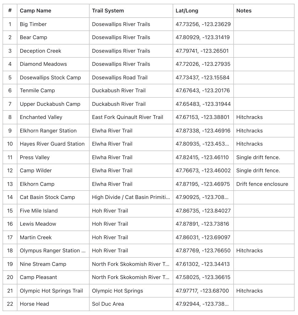Sol Duc Campground – 1 group site that allows horses, hitching rail. It may be reserved through the Sol Duc Hot Springs Resort online at www.recreation.gov or by calling Aramark at (877)-444-6777.