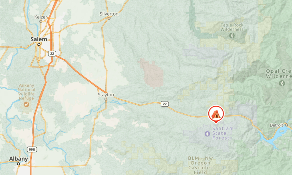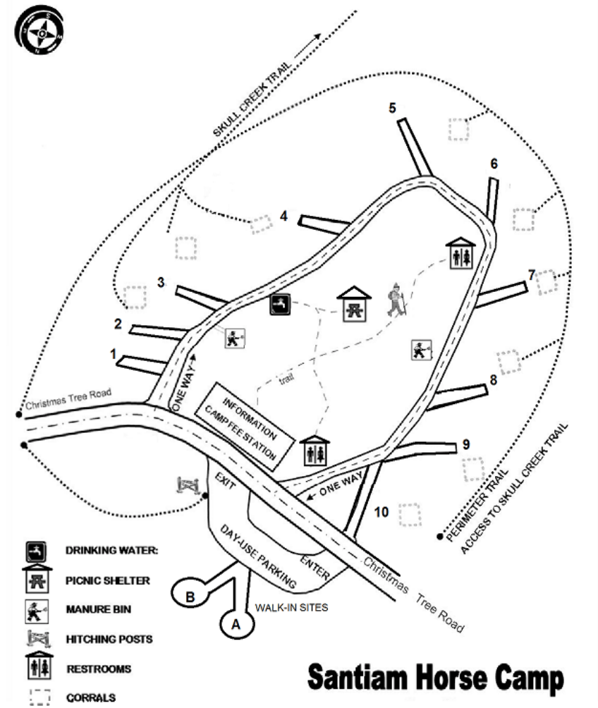 Directions: From Salem: Take Highway 22 Eastbound for 30 miles until you reach the town of Gates. Turn right (south) onto Horeb Road and drive about 300 feet. Turn left from Horeb Road onto Sorbin Street. Drive 0.3 miles through Gates, crossing the river until you reach Gates School Road. Turn right (West) on Gates School Road and drive 1.1 miles until you reach Henness Lane. Turn left (East) at Henness Lane. Pavement ends and becomes gravel road. This is the Monument Peak Road and day-use parking area for access to the Monument Peak Trail System. Drive 1.1 miles up Monument Peak Road until you reach Xmas Tree Road. Turn right (west) on Xmas Tree Road. Drive 0.3 miles to Santiam Horse Camp.