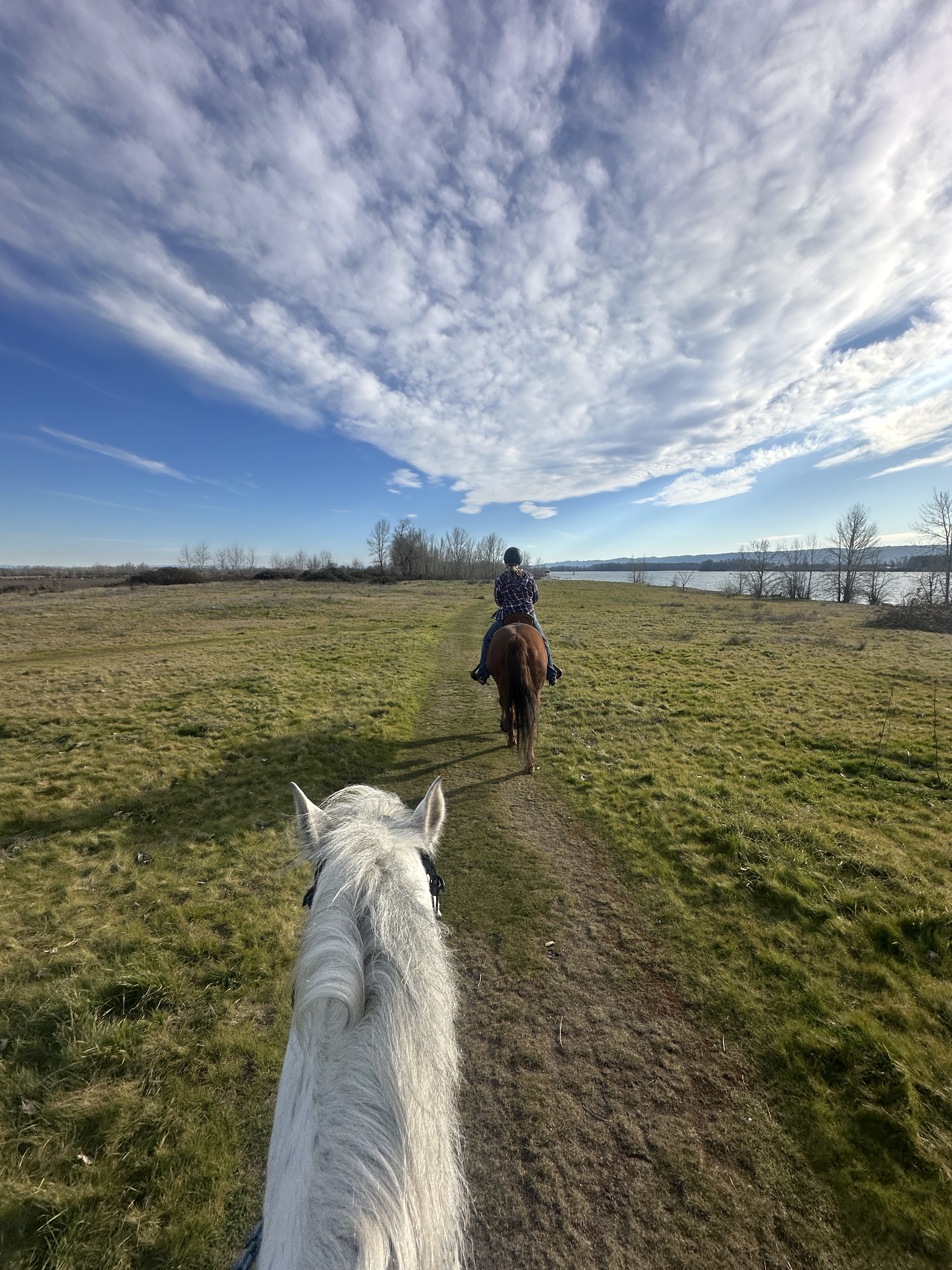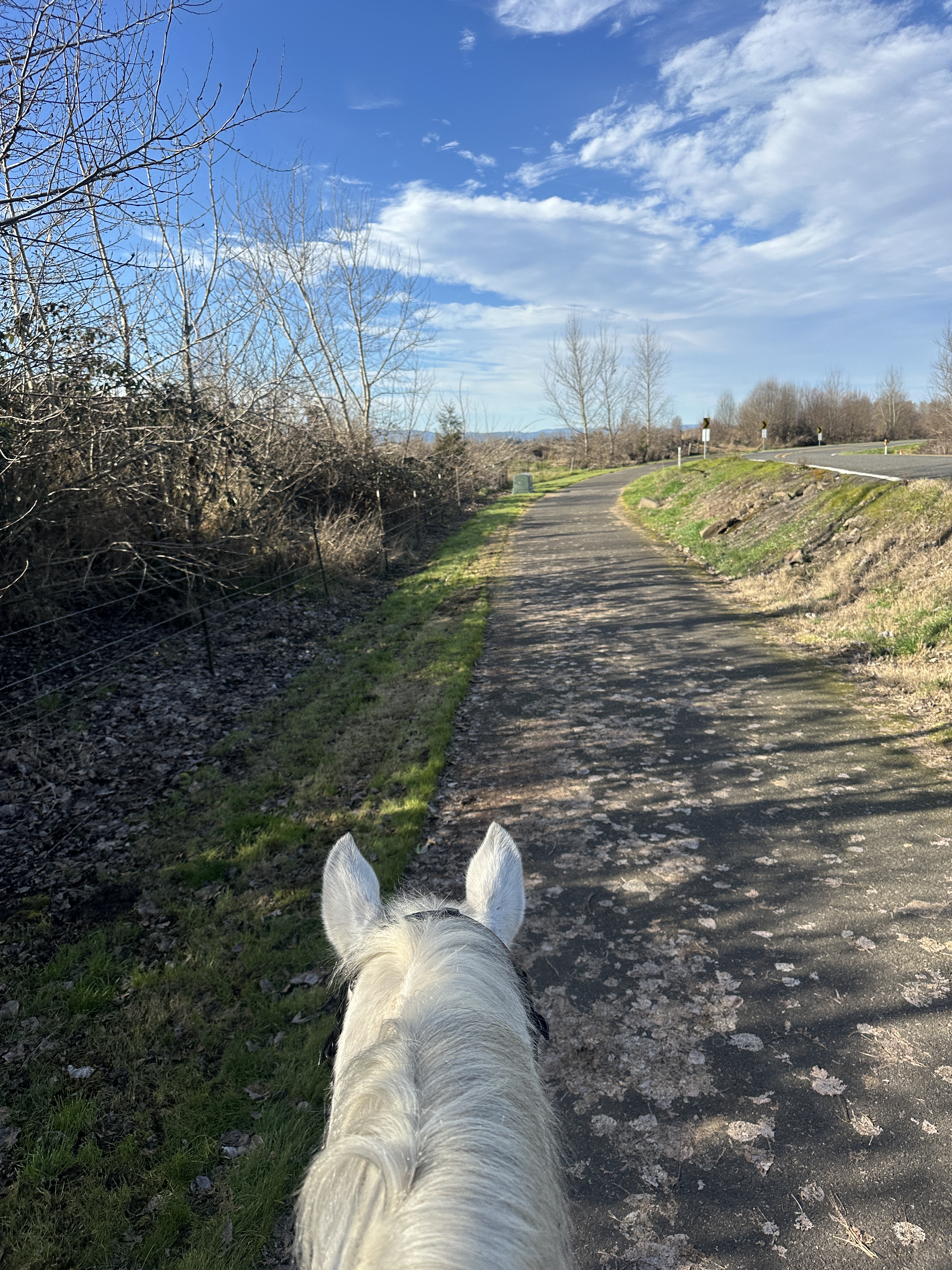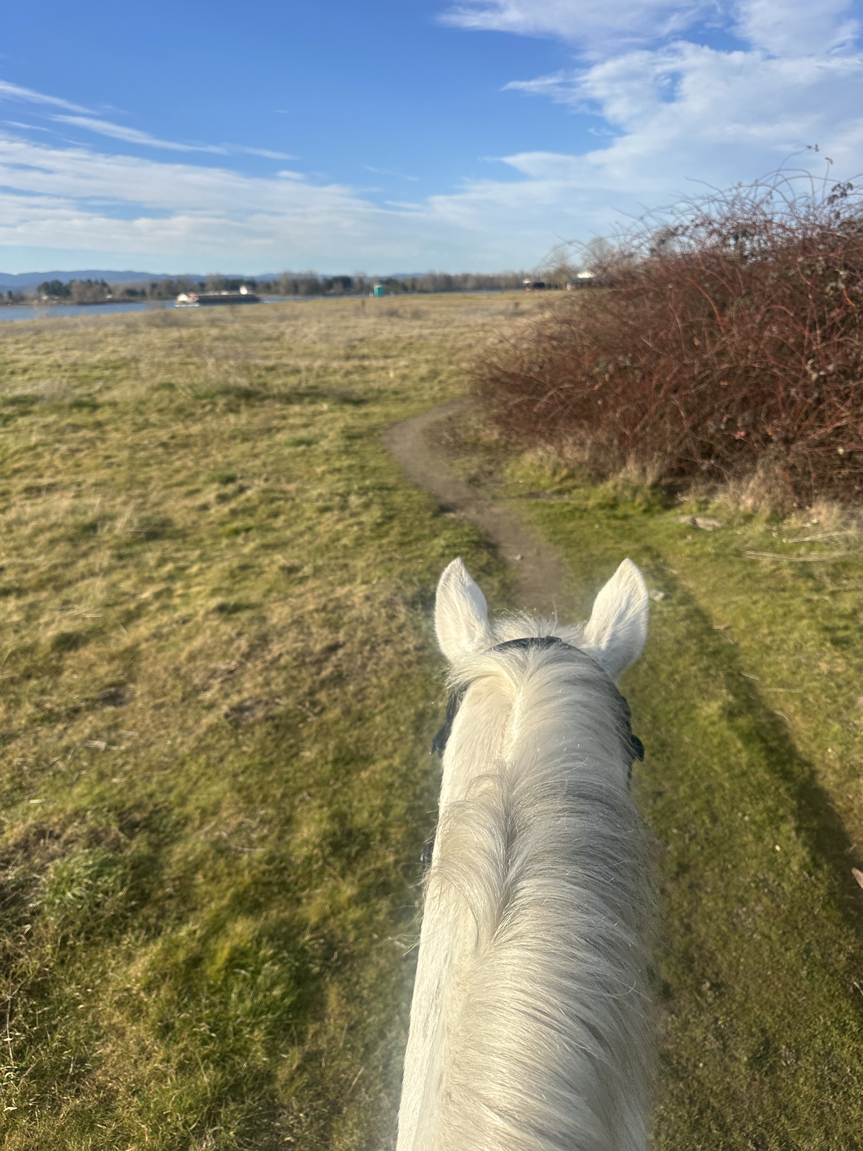 I have ridden here once before on the Vancouver Lake side – with no issues. We did not encounter signs that prohibited horses, and the ride was short, flat and pleasant. We parked in the same spot this time and headed out on the paved multi-user path towards Frenchman’s Bar Regional Park this time. Tide was in, so there wasn’t much beach to ride on but found a nice worn, dry user path past the main park area to get a canter in. Once we left the park we found a sign saying no horses.