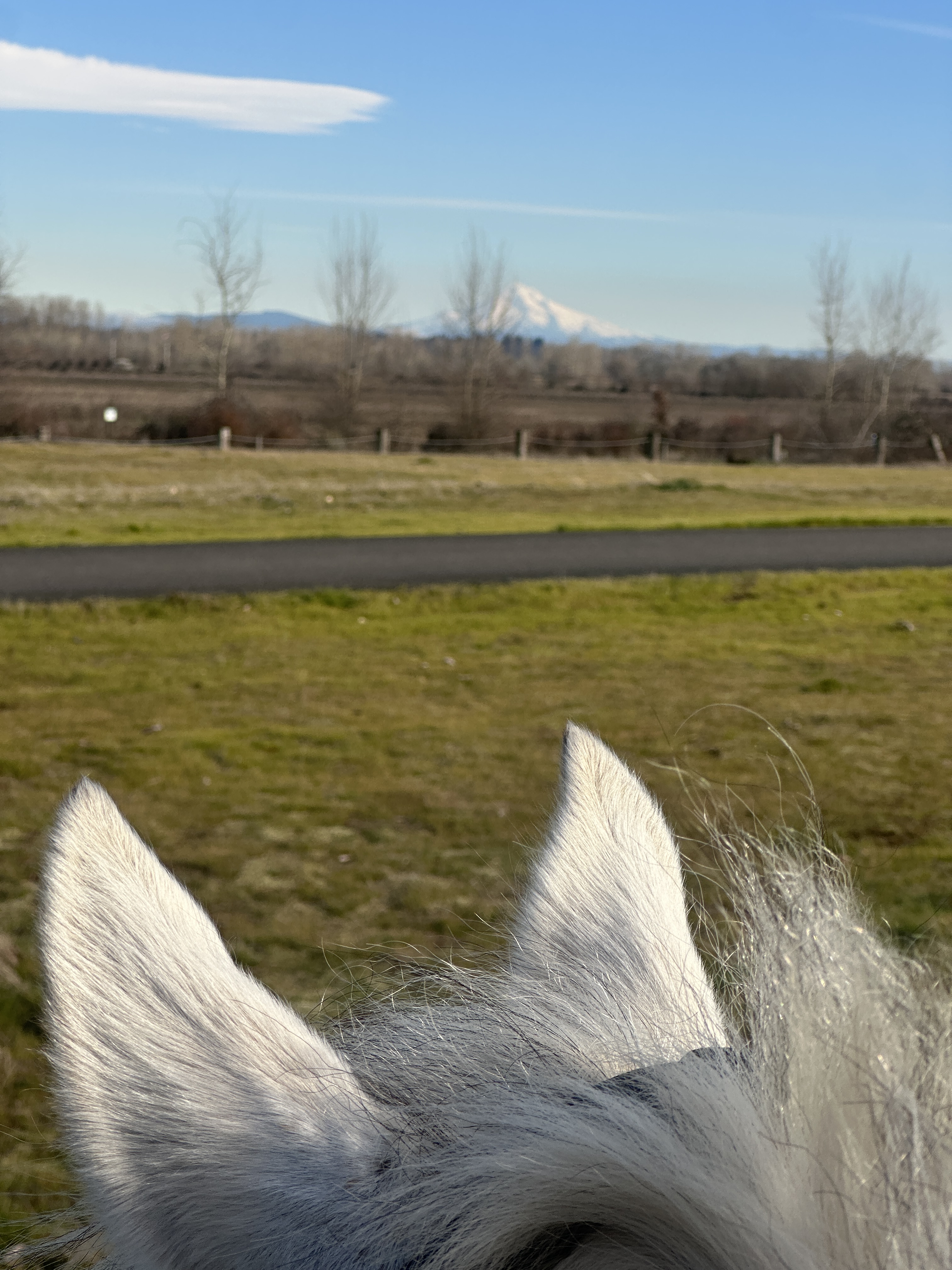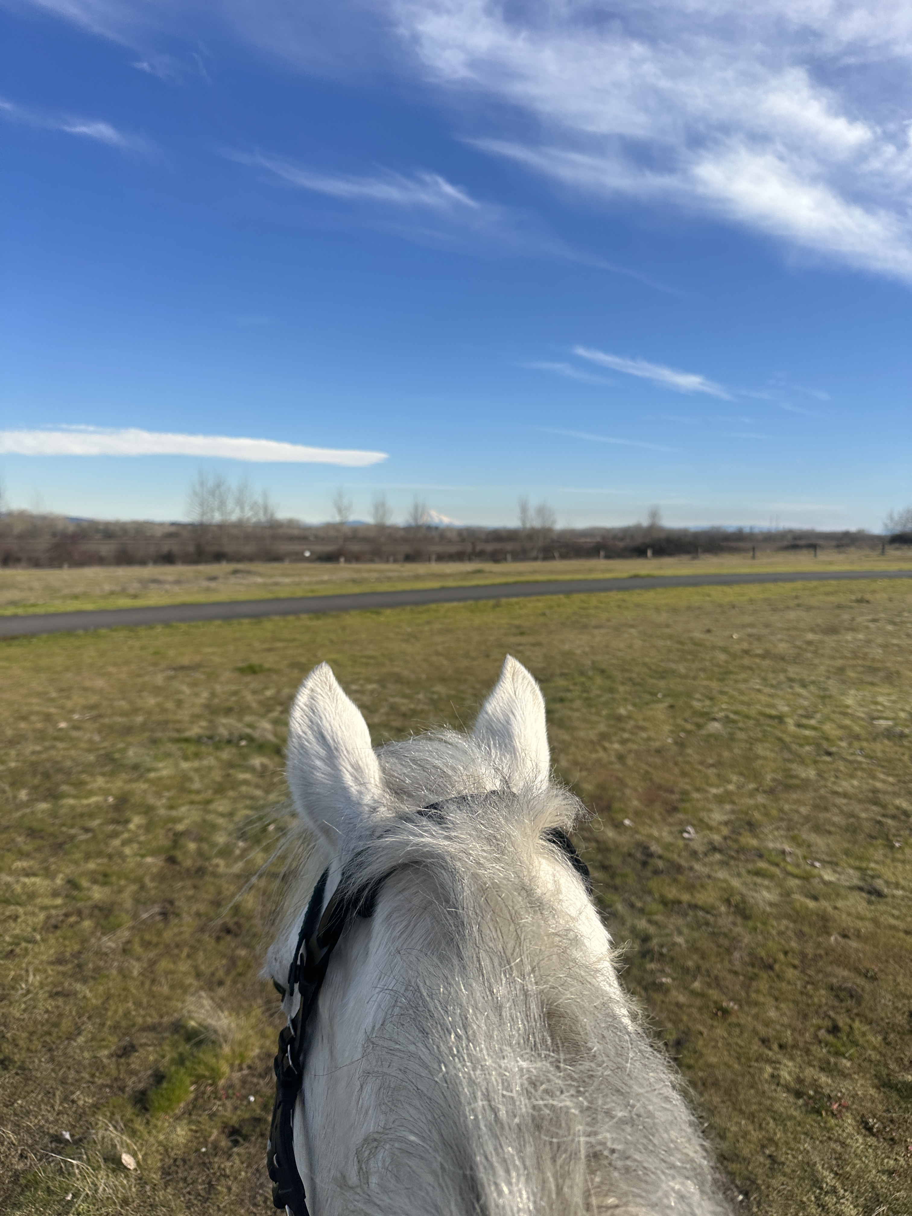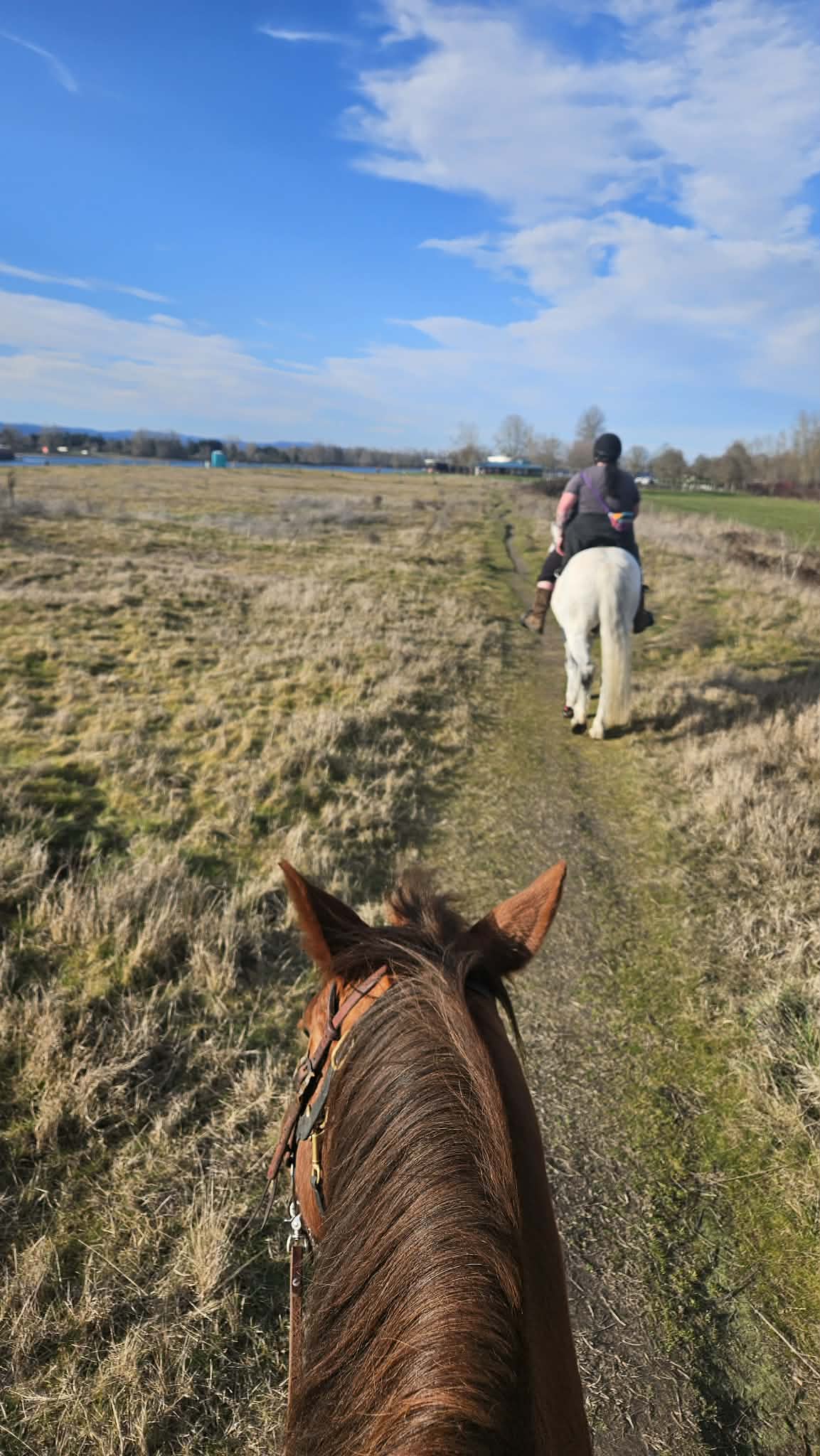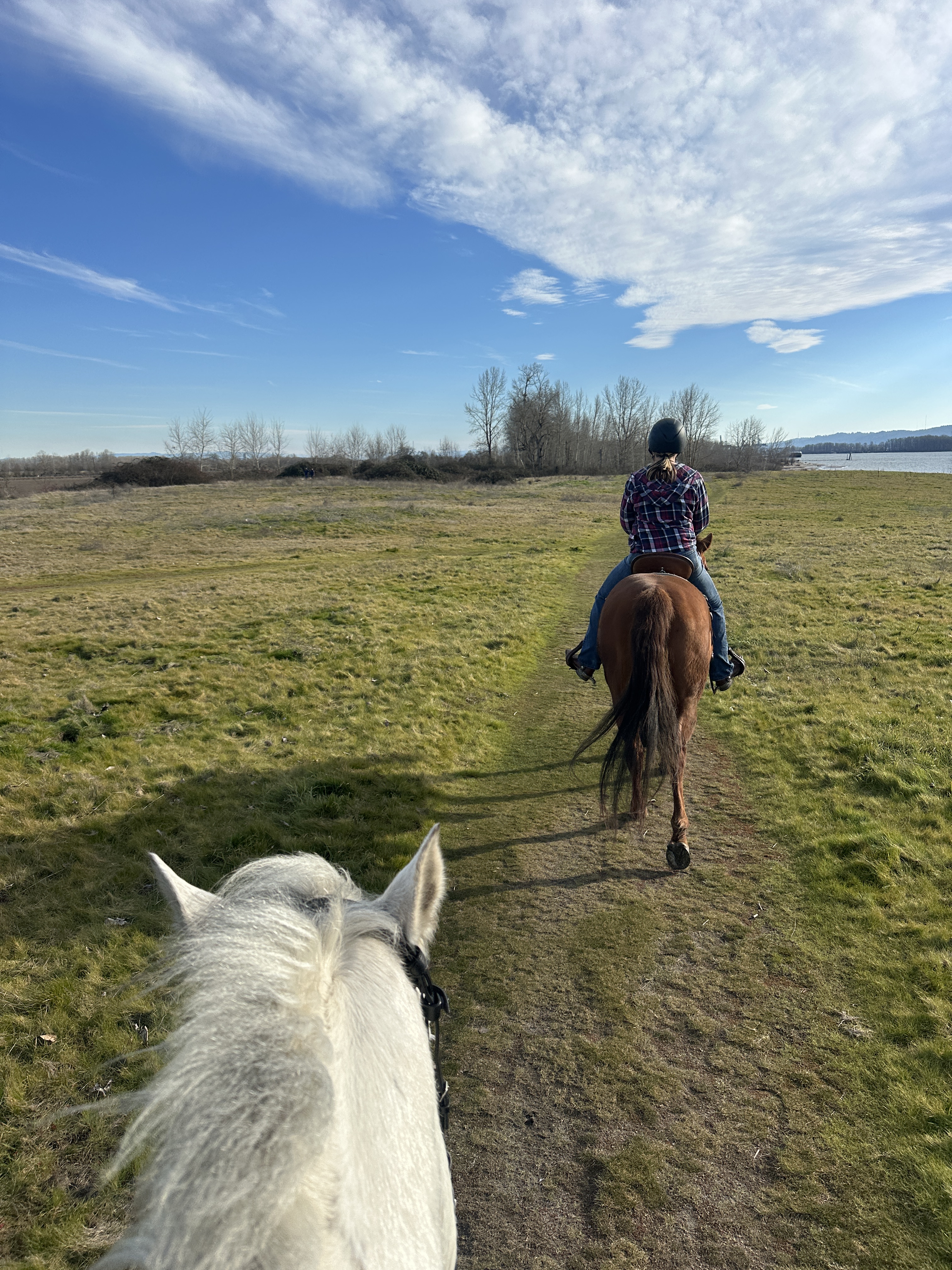 I have ridden here once before on the Vancouver Lake side – with no issues. We did not encounter signs that prohibited horses, and the ride was short, flat and pleasant. We parked in the same spot this time and headed out on the paved multi-user path towards Frenchman’s Bar Regional Park this time. Tide was in, so there wasn’t much beach to ride on but found a nice worn, dry user path past the main park area to get a canter in. Once we left the park we found a sign saying no horses.