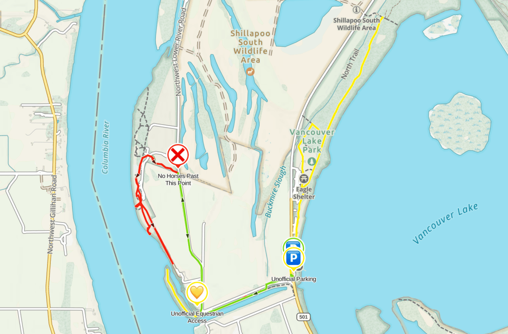 Could we have just taken the wrong exit trail from the park? I’m unsure but on further research the current listing for this park is now stating horses are only allowed on the “trail between Vancouver Lake and Frenchman’s Bar Park“. This would be a rather pointless ride on sidewalks with no real destination.